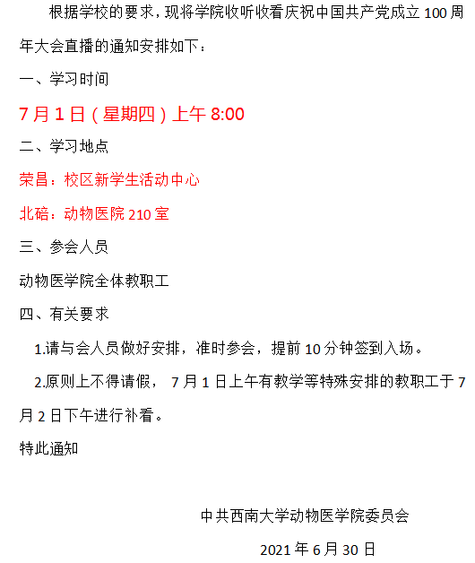 关于收听收看庆祝中国共产党成立 100周年大会直播的通知