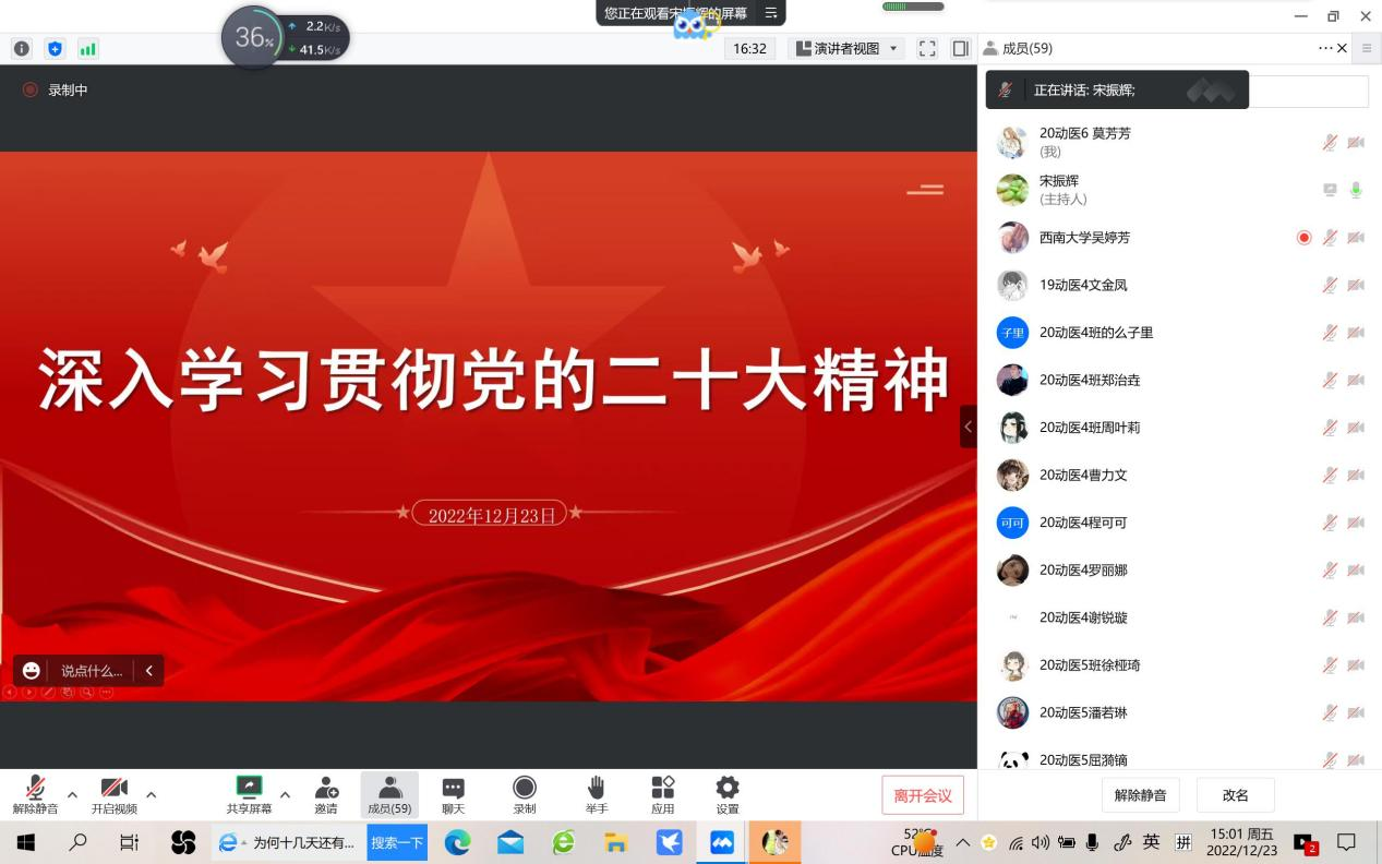 12月28日下午,本科生二支部全体党员和积极分子通过线上腾讯会议方式开展了以“学习贯彻党的二十大精神,坚定不移听党话,跟党走”为主题的党日活动。活动由支部书记吴婷芳同志主持。