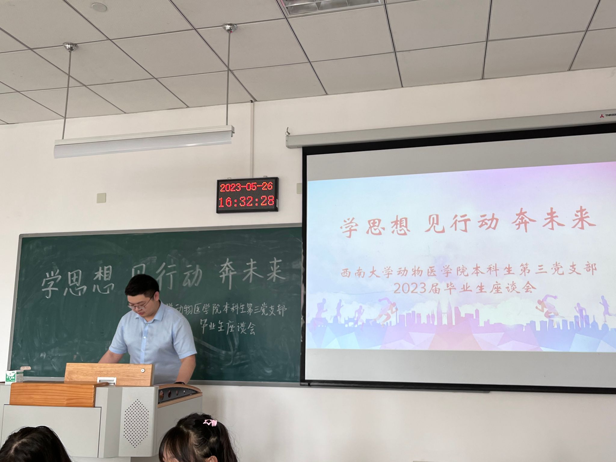 本科生第三党支部在西南大学荣昌校区7B404活动室开展以“学思想,见行动,奔未来”为主题的2023届毕业生党员座谈会。人人体育
