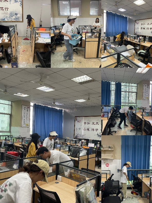 6月18日下午16:00。毕业生党员们明确分工,分小组进行。分别对学习室的窗台、地面、桌面进行清洁整理,仔细检查各个角落,排除学习室安全隐患。毕业生清清爽爽毕业,也为师弟师妹们营造一个干净整洁的学习环境。