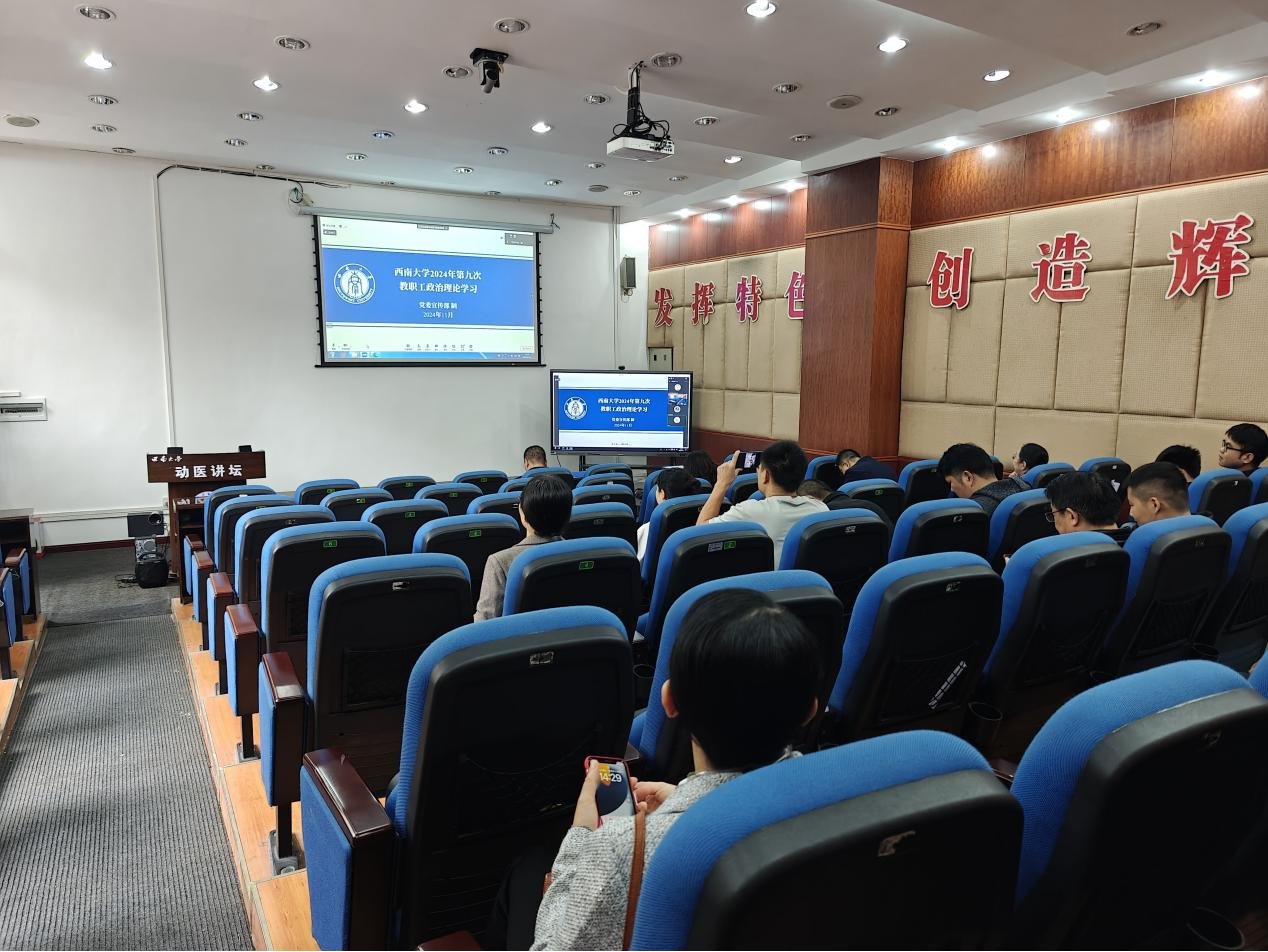 在荣昌、北碚同步召开2024年第九次教职工政治理论学习,集中学习了习近平总书记在省部级主要领导干部学习贯彻党的二十届三中全会精神专题研讨班开班式上的重要讲话精神、习近平总书记在中共中央政治局第十七次集体学习时的重要讲话精神、习近平总书记在全国民族团结进步表彰大会上的重要讲话精神、习近平总书记给中国海洋大学全体师生回信和给中国国际大学生创新大赛参赛学生代表的回信精神、师德师风警示教育,党委书记黄昌建主持。