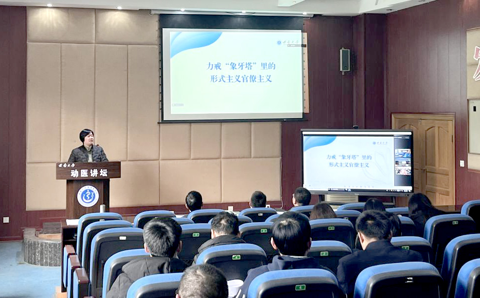 党委副书记、纪委书记罗丹领学了《力戒“象牙塔”里的形式主义、官僚主义》,强调形式主义、官僚主义是我们党的大敌、人民的大敌;要从讲政治的高度来审视,从思想和利益根源上来破解形式主义、官僚主义;贯彻落实中央决策部署不能空喊口号、流于形式;让基层干部从文山会海中解脱出来;改进督查检查考核方式方法;必须做好深入扎实的调查研究工作。还结合学部实际情况分析了“象牙塔”里的形式主义、官僚主义的常见现象。