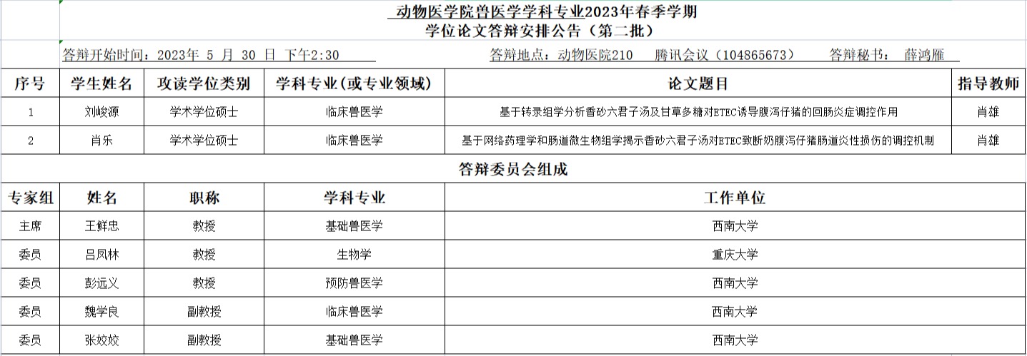 人人体育 兽医学学科专业2023年春季学期学位论文答辩安排公告(第二批)