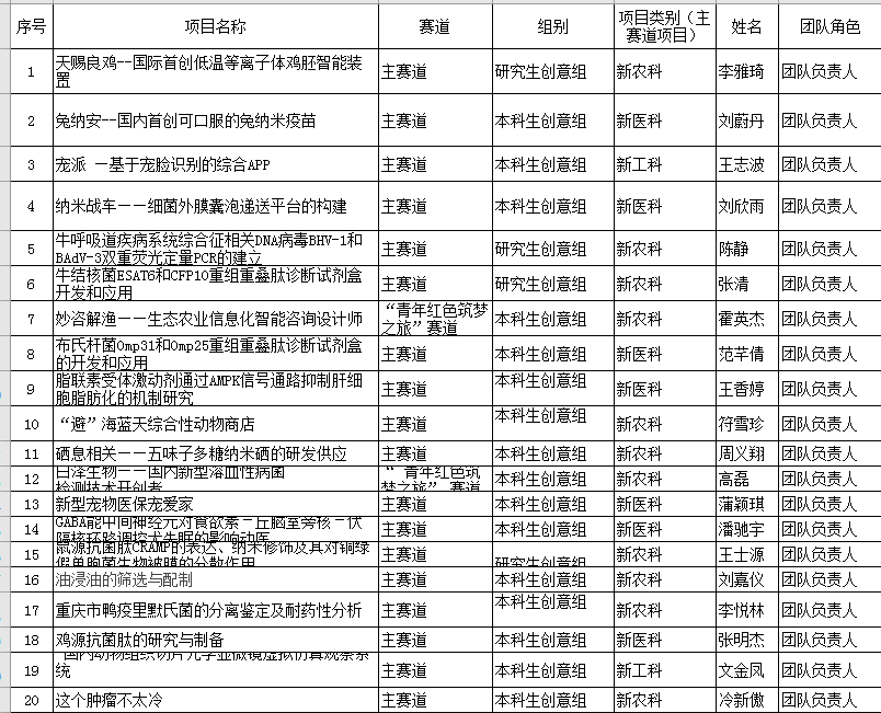 根据人人体育 《2022年“互联网+”大学生创新创业大赛选拔赛》的通知要求,学生自愿报名,专家已评审出前20名参赛团队。名单如下: