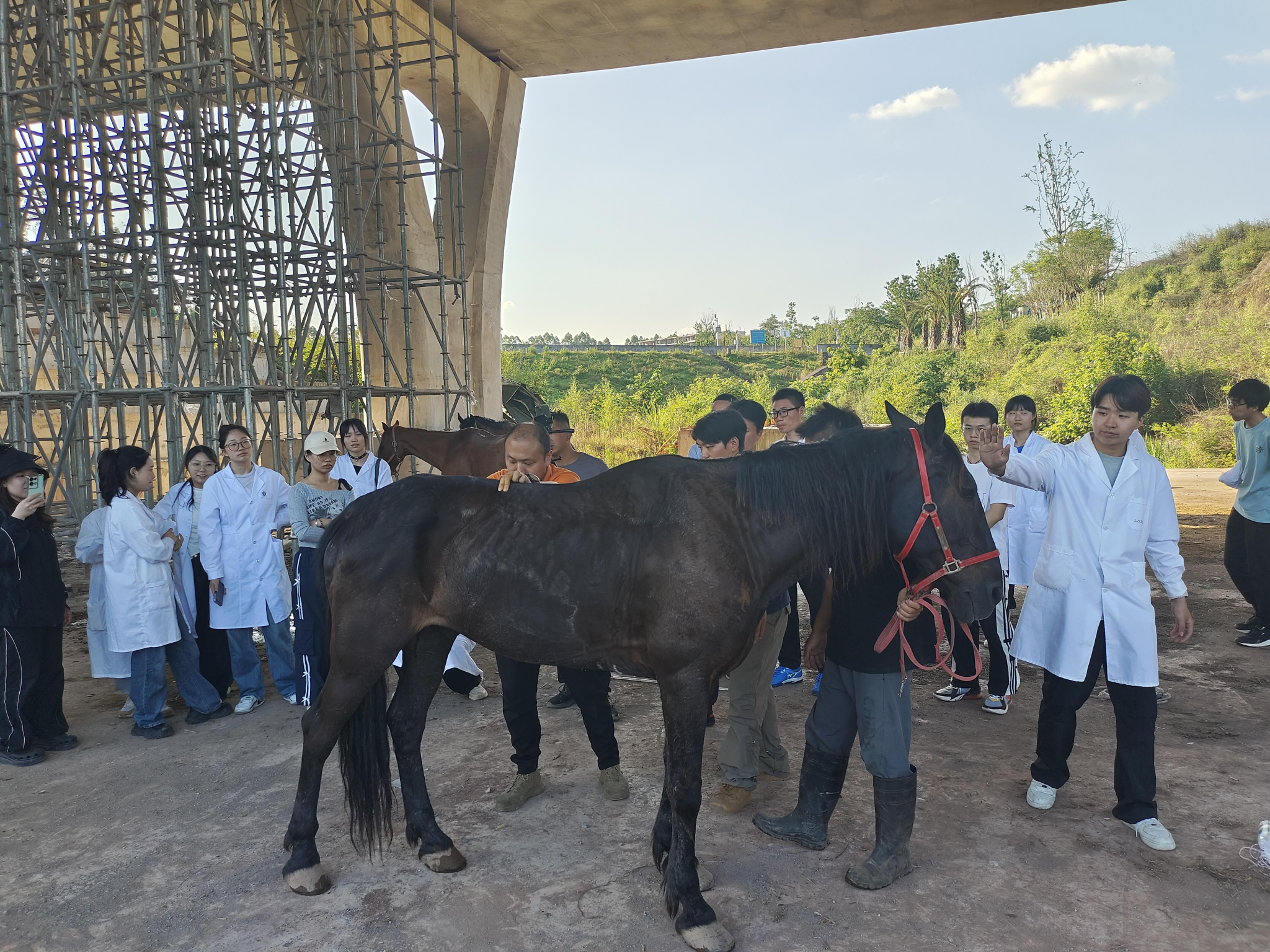 2022级中兽医学专业及2024级兽医公共卫生专业学生,在副院长宋振辉、中兽医系董世起和杜红旭等老师的带领下,前往重庆市璧山区黑豹马场,开展了一堂生动的沉浸式中兽医针灸实训实践课程。