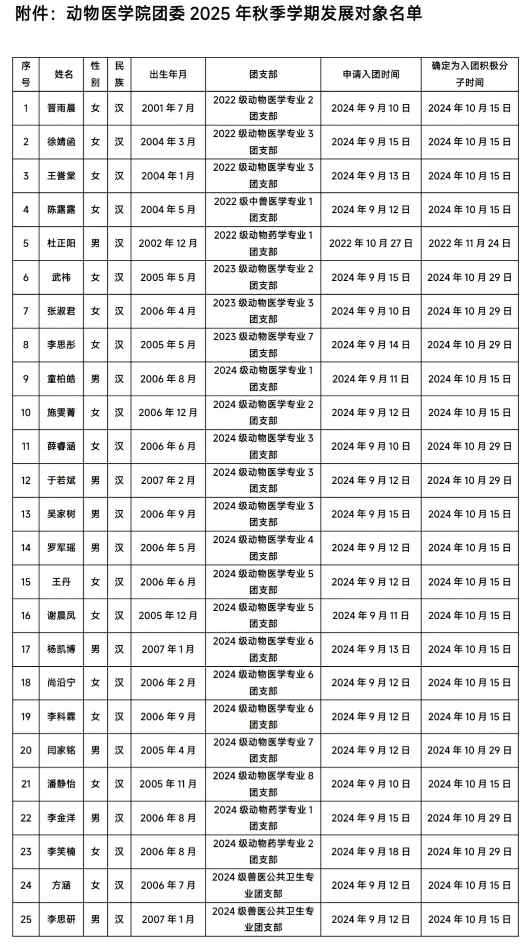 根据《关于新时代新征程加强和改进团员队伍建设工作的意见》《中国共产主义青年团发展团员工作细则》的要求,拟确定晋雨晨等25名同学为2025年秋季学期发展对象,现予以公示。