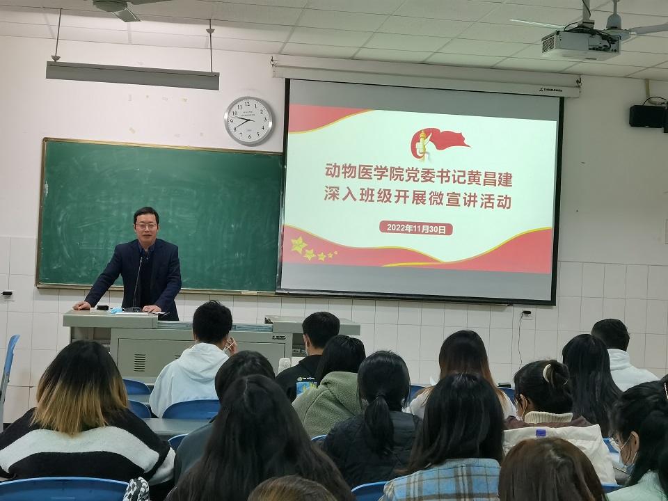 党委书记黄昌建深入2020级动物医学专业7班、8班,以学习宣传贯彻党的二十大精神为主题,用通俗易懂、简短精悍的语言进行了精准的解读。宣讲主题鲜明、紧扣实际、内容丰富,为同学们深刻理解、全面把握党的二十大精神提供了权威辅导。