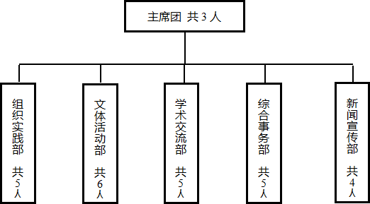 4.不设正副主席,设轮值主席,由主席团成员轮值担任,以学期为轮值周期。除主席团、负责人、工作人员外未设其他职务。 |