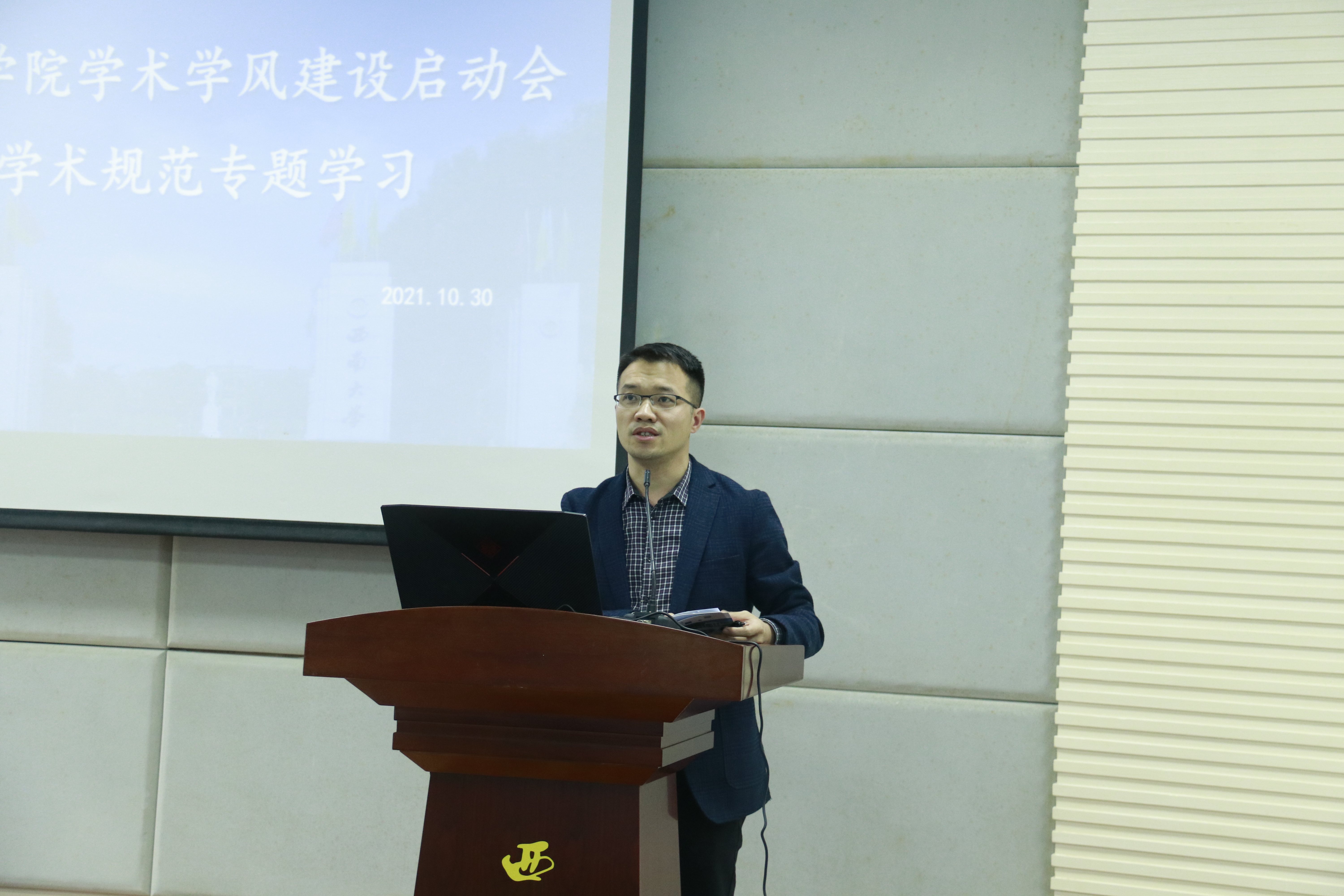 副院长方仁东老师带领大家学习学术规范相关文件及规定,介绍学术不端的概念与具体内涵、常见的学术不端行为等,强调学术不端的严重后果,提醒同学们树立底线警示意识。
