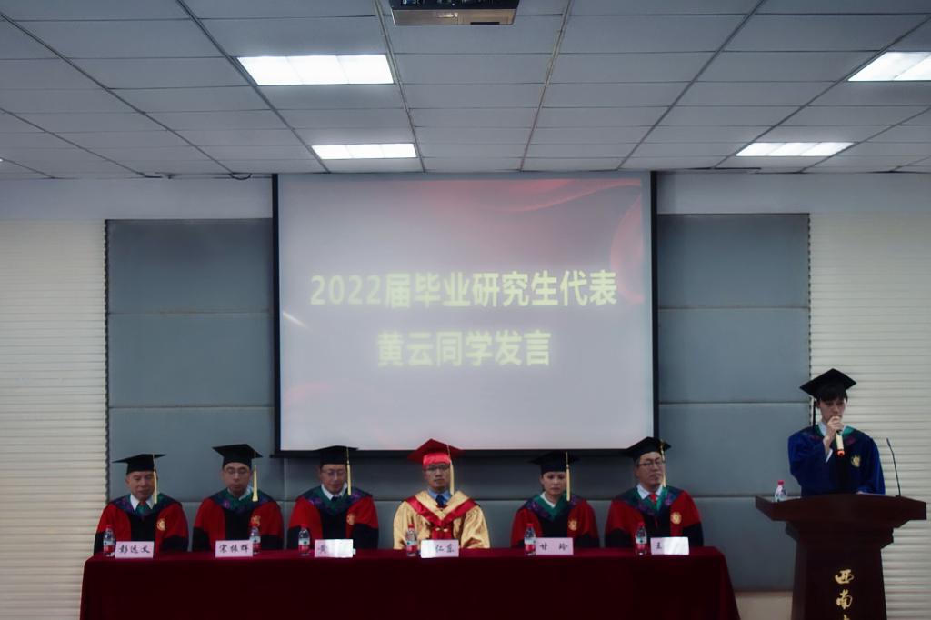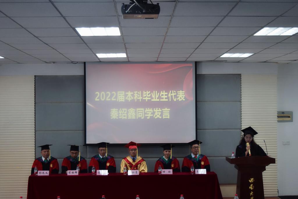党委书记黄昌建宣读《西南大学关于准予2022年春季学期研究生毕(结)业的决定》、《西南大学关于准予2022届全日制普通本科学生毕(结)业的决定》,副院长宋振辉宣读《西南大学关于表彰2022年优秀大学毕业生和优秀毕业研究生的决定》及获表彰名单,主席台就坐领导和老师为毕业生代表颁发了毕业证书及优秀毕业生荣誉证书。