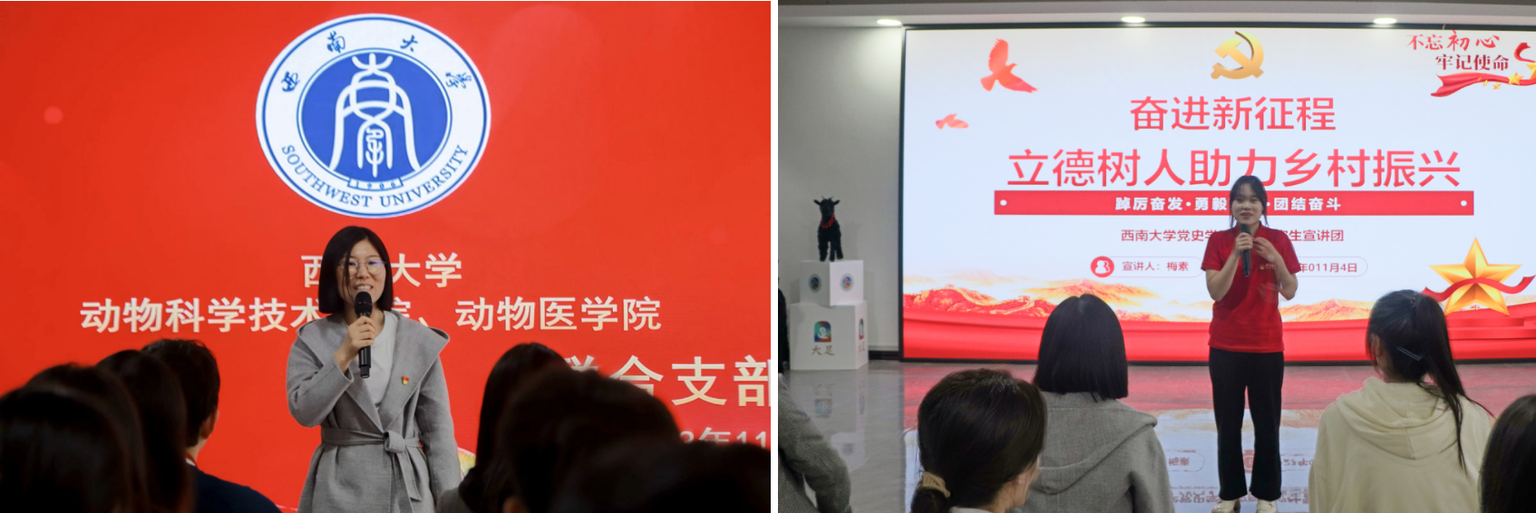 研究生第二党支部书记范成莉同志对样板党支部的建设经验与发展成果进行交流汇报,紧接着研究生宣讲团成员梅素同志以“立德树人助力乡村振兴”为主题进行宣讲。