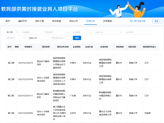 江莎老师、宋振辉老师牵头申报的与瑞派宠物医院管理股份有限公司、新瑞鹏宠物医疗集团有限公司和重庆正大农牧食品有限公司共建的定向人才培养培训项目、就业实习基地项目四个项目正式获批立项。