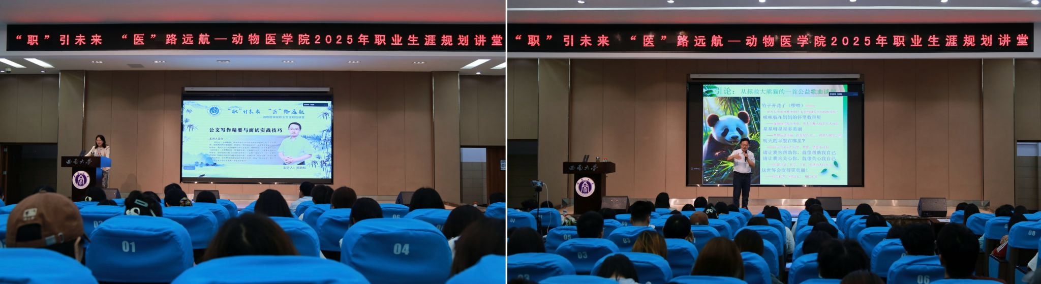 讲座伊始,郑教授以一首拯救大熊猫的公益歌曲作为独特引子,其声情并茂地演绎,瞬间吸引了全场师生的关注。随后,他结合自身求职经历,深入剖析了写作与表达的“核心四要素”,并通过真实面试案例,系统拆解求职沟通的五大实用技巧,揭示了求职沟通与精准表达的底层逻辑。