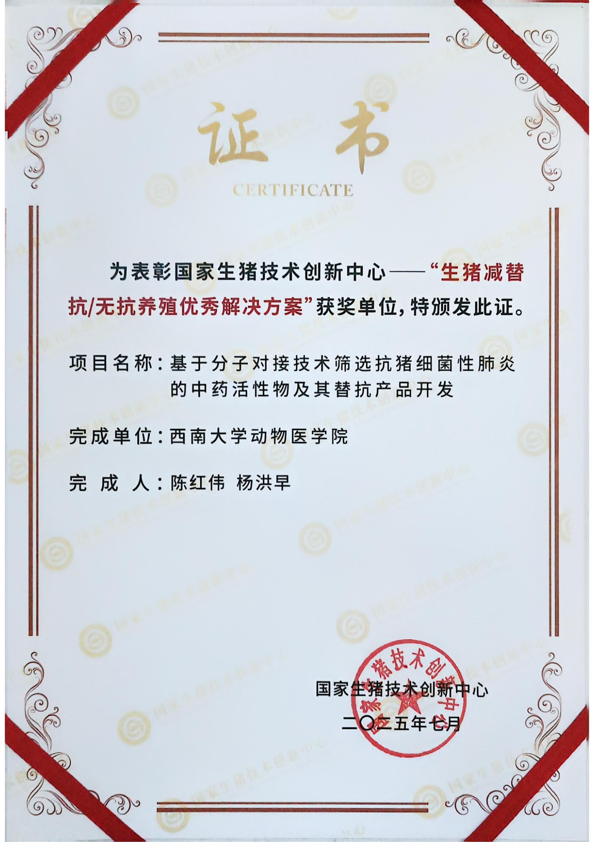 教师陈红伟教授提交的解决方案“基于分子对接技术筛选抗猪细菌性肺炎的中药活性物及其替抗产品开发”以最高分脱颖而出,并获得表彰,国家生猪技术创新中心将优先对得分前五名的优秀方案进行推广应用。