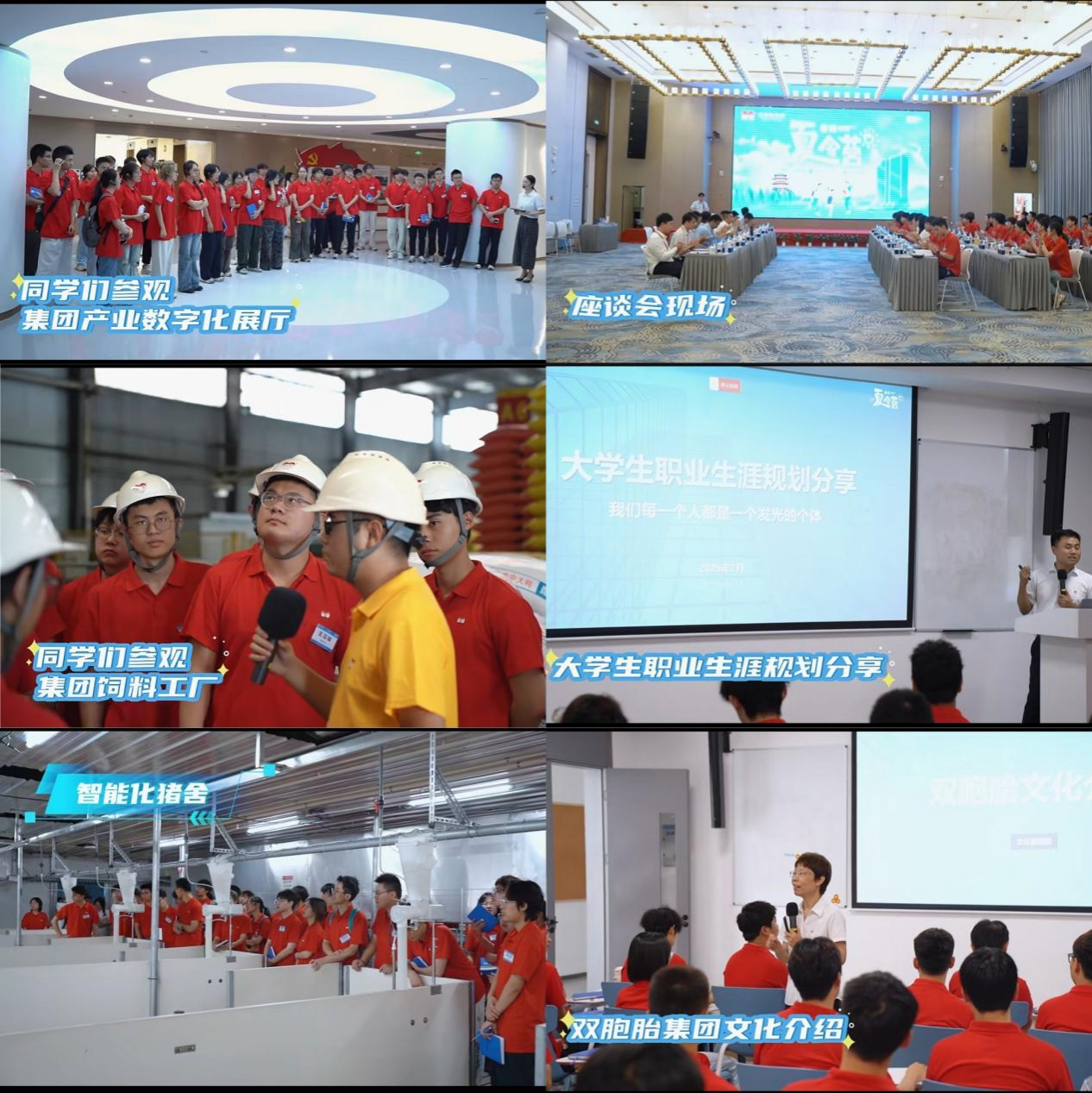 在活动中,师生们实地探访双胞胎集团总部,参观产业数字化展厅、智能化饲料工厂及智能化猪舍,直观了解从饲料生产到养殖管理的全产业链数字化、智能化的运作模式;同时,通过行业认知课程,集团领导授课及座谈交流,深入了解农牧行业的现状与发展趋势。