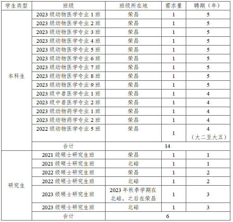 2023级本科招生预计400人,按教务处教学安排,编自然班级13个,其中动物医学专业9个班,中兽医学专业2个班,动物药学专业2个班;研究生招生约102人,人人体育
