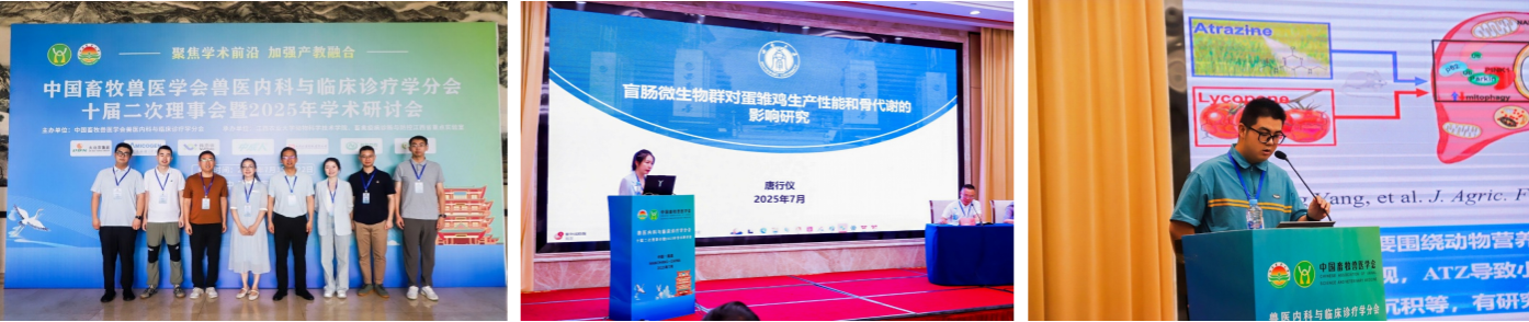 本次大会以“聚焦学术前沿,加强产教融合”为主题,围绕兽医内科与临床诊疗领域的动物营养代谢病与中毒病进行了5个专题报告和80余个大会报告。应大会邀请,唐行仪作题为“盲肠微生物群移植对蛋雏鸡生产性能和骨代谢影响的研究”的报告,研究揭示肠道菌群调控家禽骨骼发育的新路径,为集约化养殖中的代谢病防控提供重要思路;杨天宁作题为“褪黑素通过靶向Rab8a拮抗阿特拉津导致的肝细胞脂质代谢紊乱的机制研究”的报告,聚焦环境毒素肝毒性机制,为开发绿色解毒剂奠定理论基础。